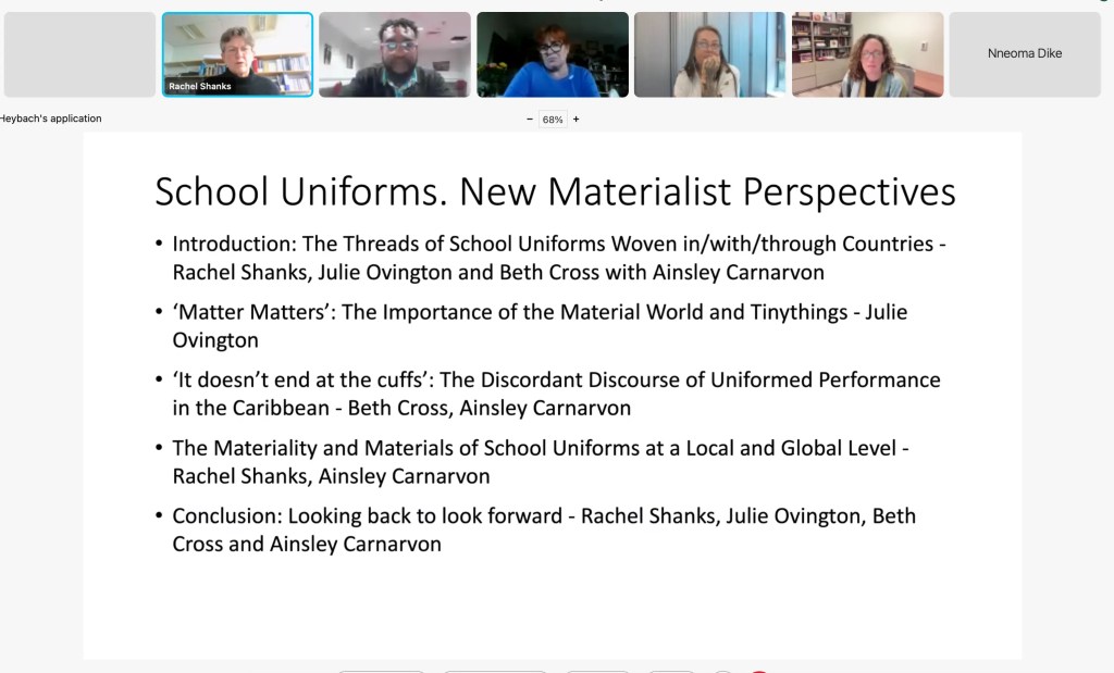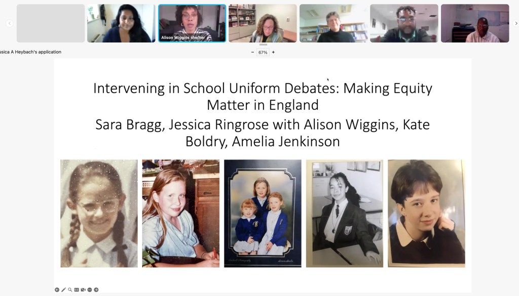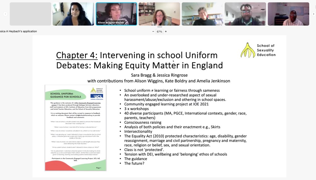 October 12 saw the online launch for the book School Uniforms: New Materialist Perspectives (edited by Rachel Shanks, Julie Ovington, Beth Cross and Ainsley Carnarvon). This book brings together a new materialist approach to understanding how school uniform imposes performances that have a formative effect on young people’s identities and economic positionality. In Chapter 4, titled “Intervening in School Uniform Debates: Making Equity Matter in England “, our FEELers Dr. Sara Bragg and Prof. Jessica Ringrose, with contributions by Alison Wiggins, Kate Boldry and Amelia Jenkinson, discuss a community-engaged learning project at the Institute of Education. At the book launch, Alison Wiggins and the current CEO of School of Sexuality Education Dolly Padalia talked on behalf of the whole project team about what has been done in the project and its impact. This blog introduces the book chapter, drawing also on Alison and Dolly’s contributions at the launch.