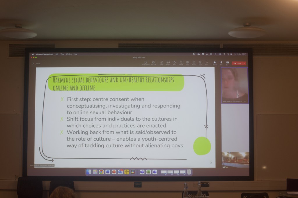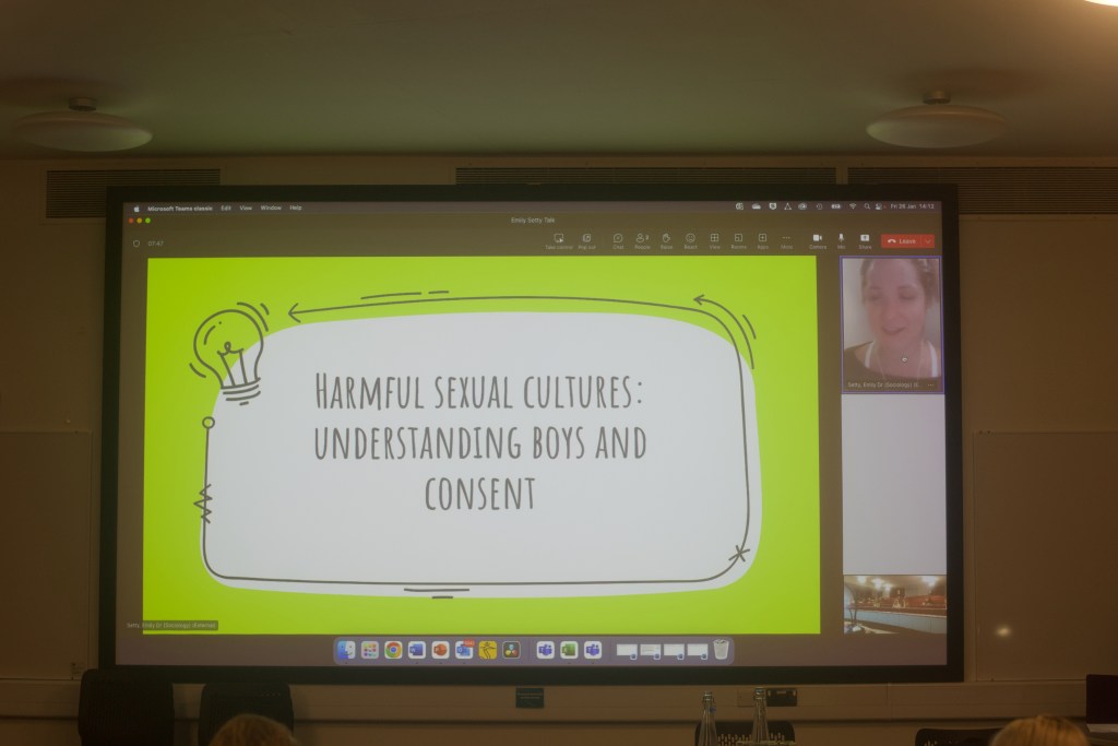 Dr Emily Setty has been doing some research with teenage boys about some of their perspectives on complex topics, particularly around sex and consent. In this presentation, she foregrounded the disparity between theoretical understanding and real-world experiences about sex consent.